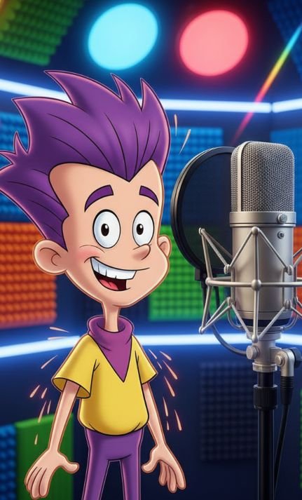 “Dynamic collage of animated Sheen Estevez moments with a real-life voice actor at a recording booth, comic-style layout.”
